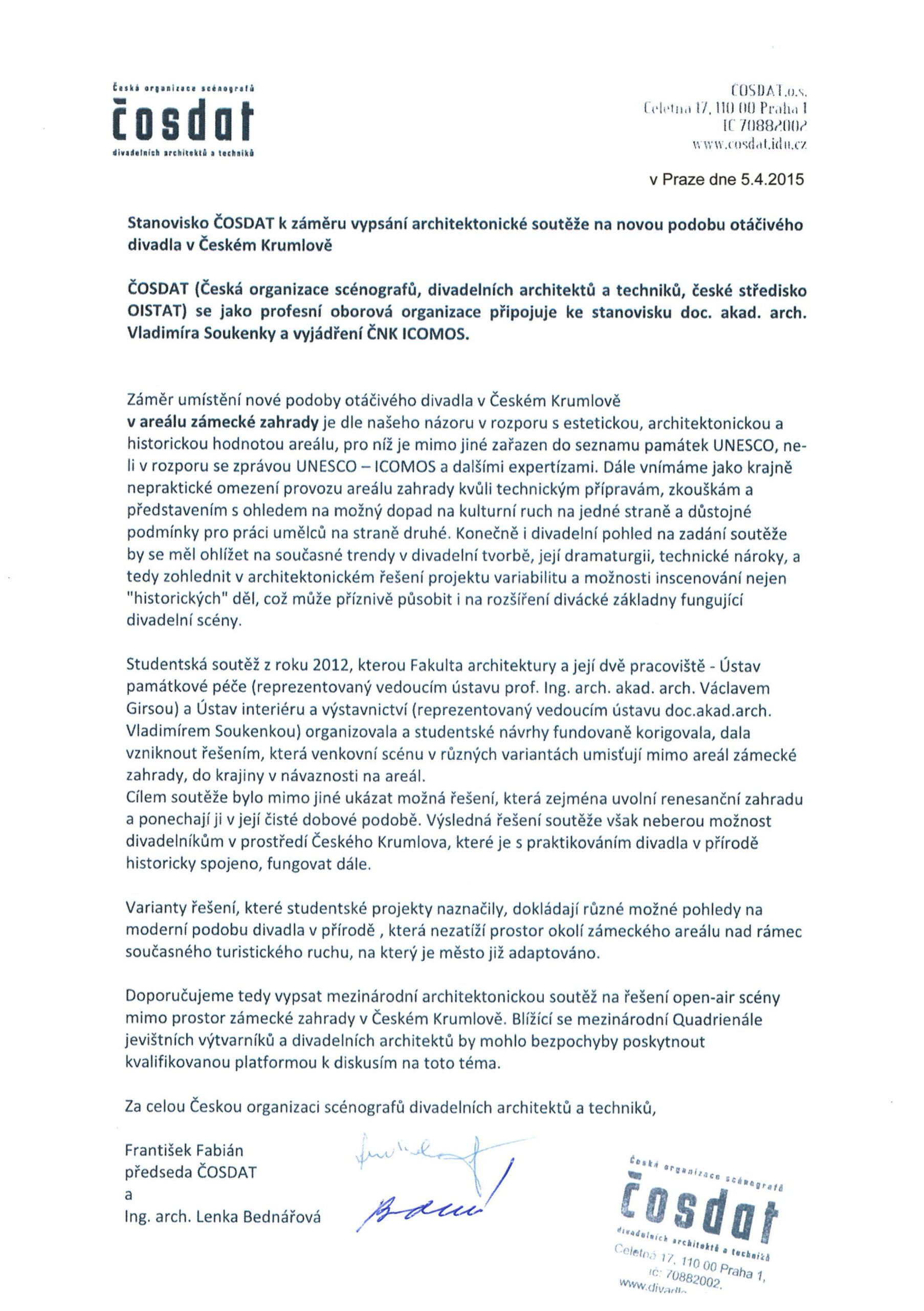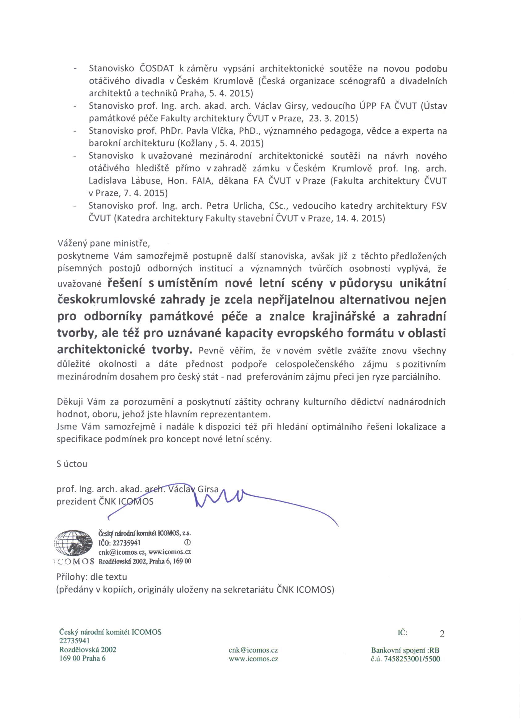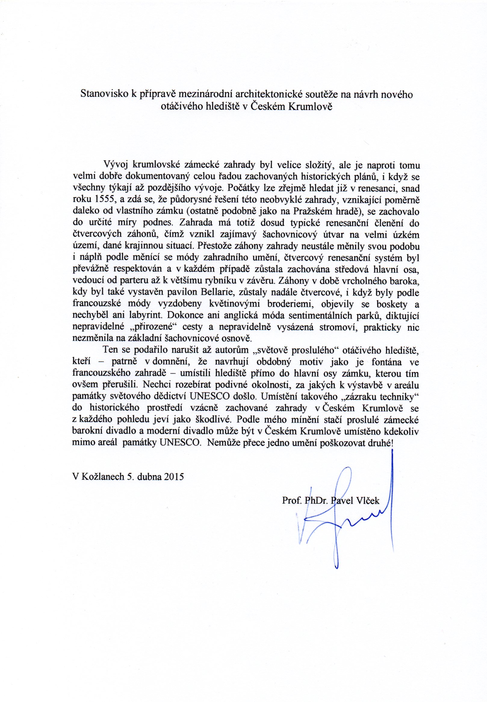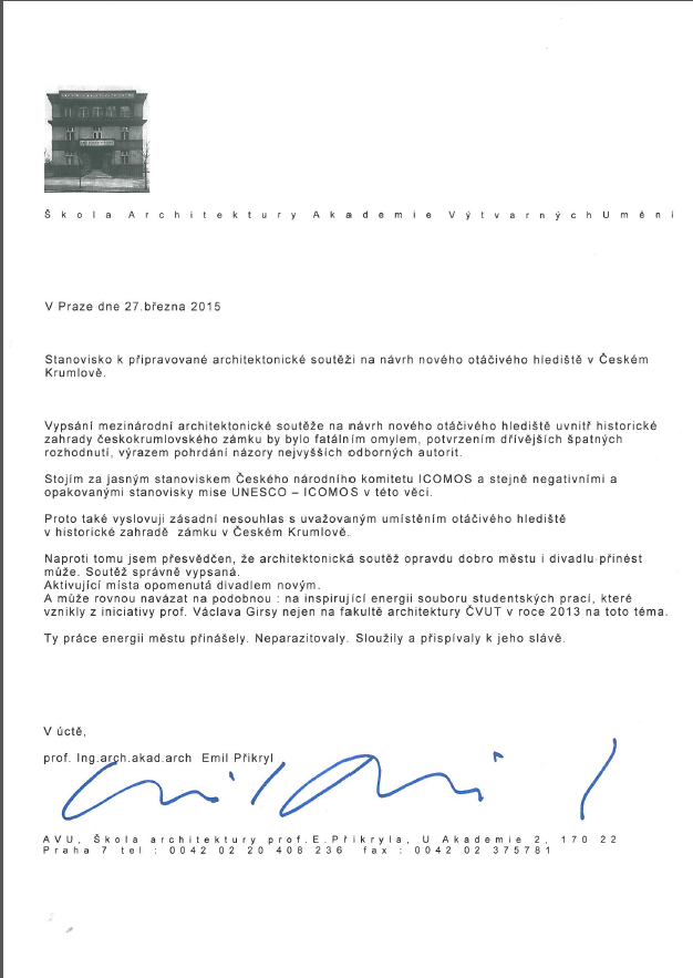 Řešení s umístěním nové letní scény v půdorysu unikátní českokrumlovské zahrady je zcela nepřijatelnou alternativou nejen pro odborníky památkové péče a znalce krajinářské a zahradní tvorby, ale též pro uznávané kapacity evropského formátu v oblasti architektonické tvorby, významná pedagogická a vědecká pracoviště.
