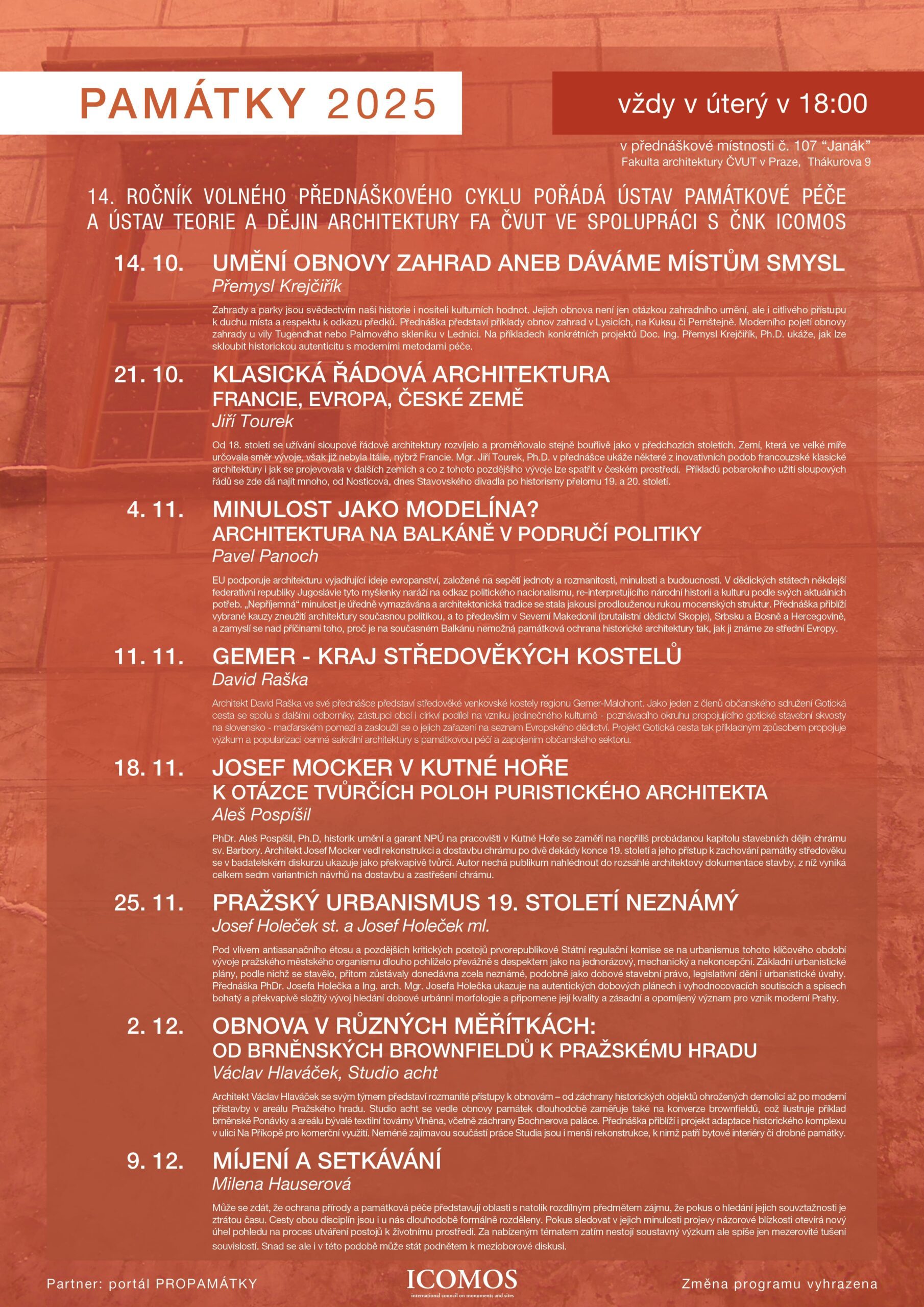 Dovolte nám, abychom Vás pozvali na letošní 14. ročník přednáškového cyklu Památky, který začíná 14. října a bude probíhat opět každé úterý od 18.00 v posluchárně č. 107 JANÁK v budově Fakulty architektury ČVUT v Praze – Dejvicích.