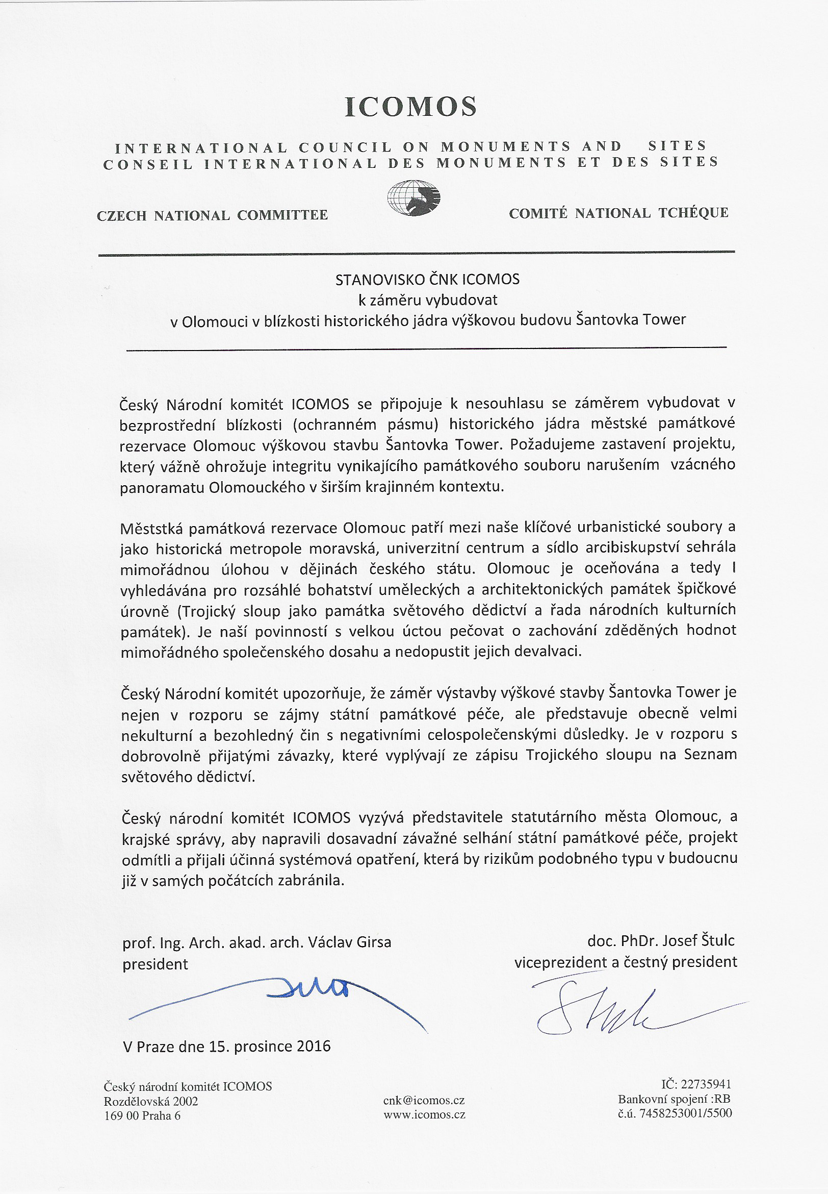 Český Národní komitét ICOMOS se připojuje k nesouhlasu se záměrem vybudovat v bezprostřední blízkosti (ochranném pásmu) historického jádra městské památkové rezervace Olomouc výškovou stavbu Šantovka Tower. Požadujeme zastavení projektu, který vážně ohrožuje integritu vynikajícího památkového souboru narušením vzácného panoramatu Olomouckého v širším krajinném kontextu.