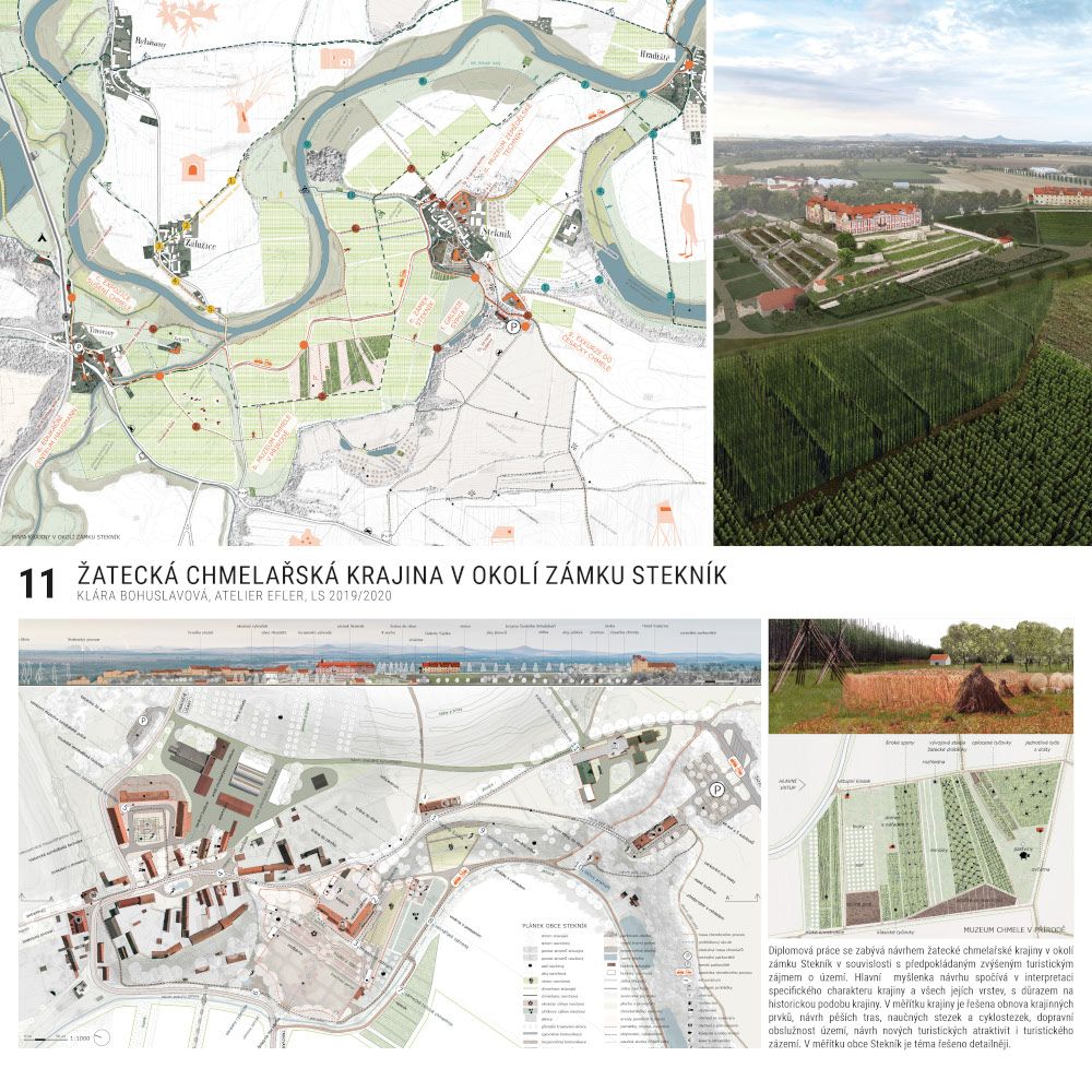 1. cena: Klára Bohuslavová (č. 11) ateliér architekta Tomáše Eflera, Revitalizace žatecké chmelařské krajiny v okolí zámku Stekník